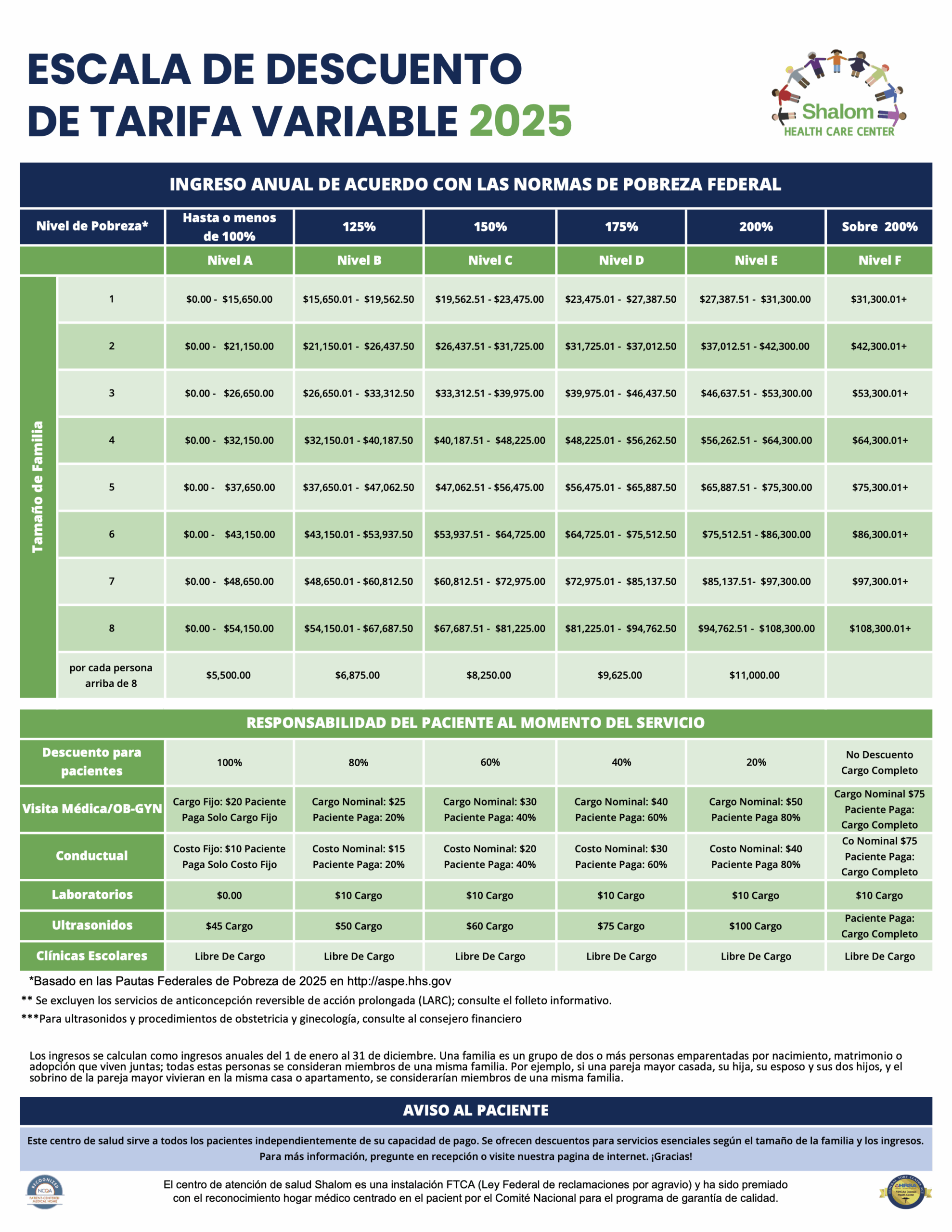 Los servicios de la clínica de atención primaria de Shalom se ofrecen en una escala de tarifas variables según el tamaño de la familia y los ingresos. Su asesor financiero trabajará con usted para aplicar todos los descuentos para los que califica y así asegurarse de que su atención médica sea lo más asequible posible.