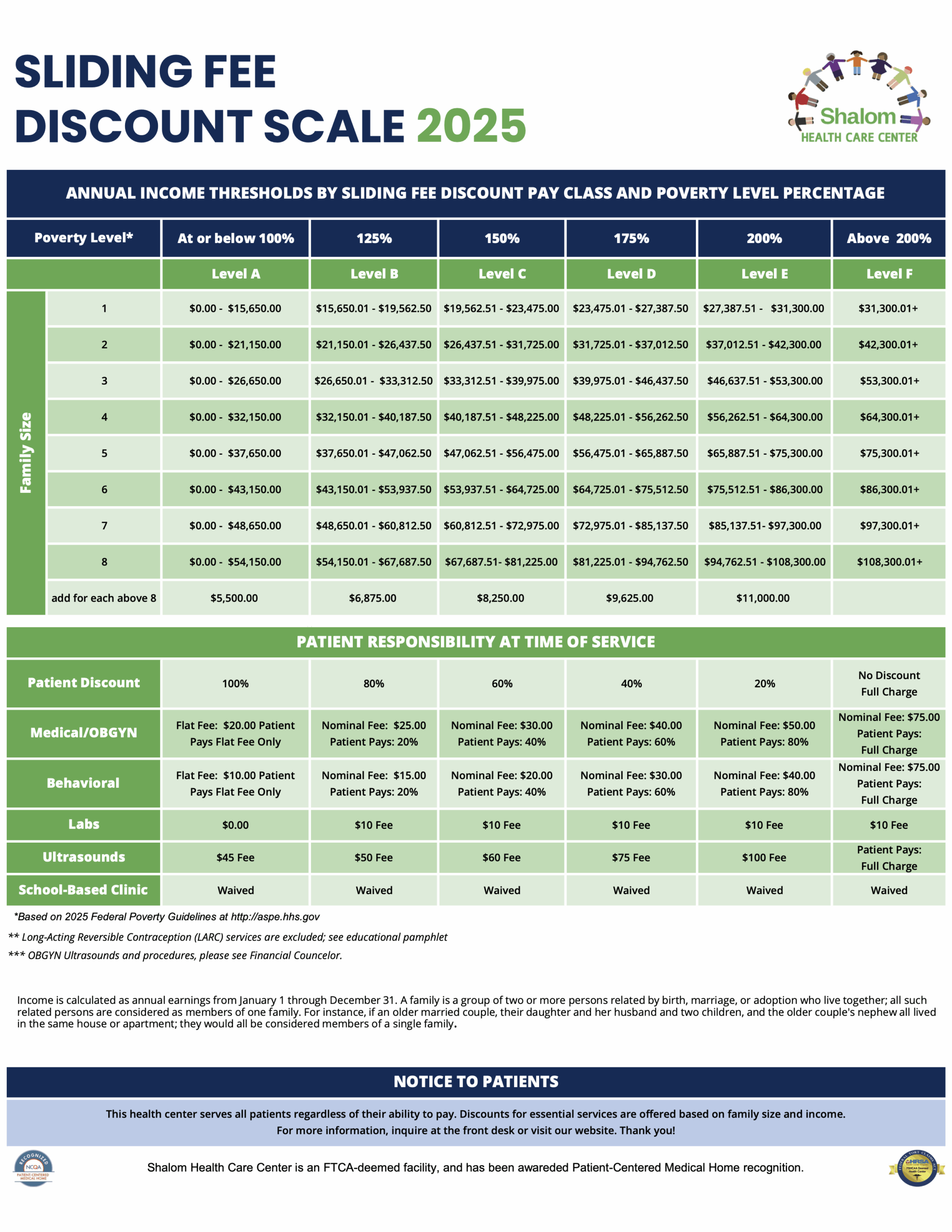 Services in Shalom’s Primary Care Clinic are offered on a sliding fee scale, based on family size and income. Your financial counselor will work with you to apply all the discounts you qualify for, to make sure that your health care is as affordable as possible.